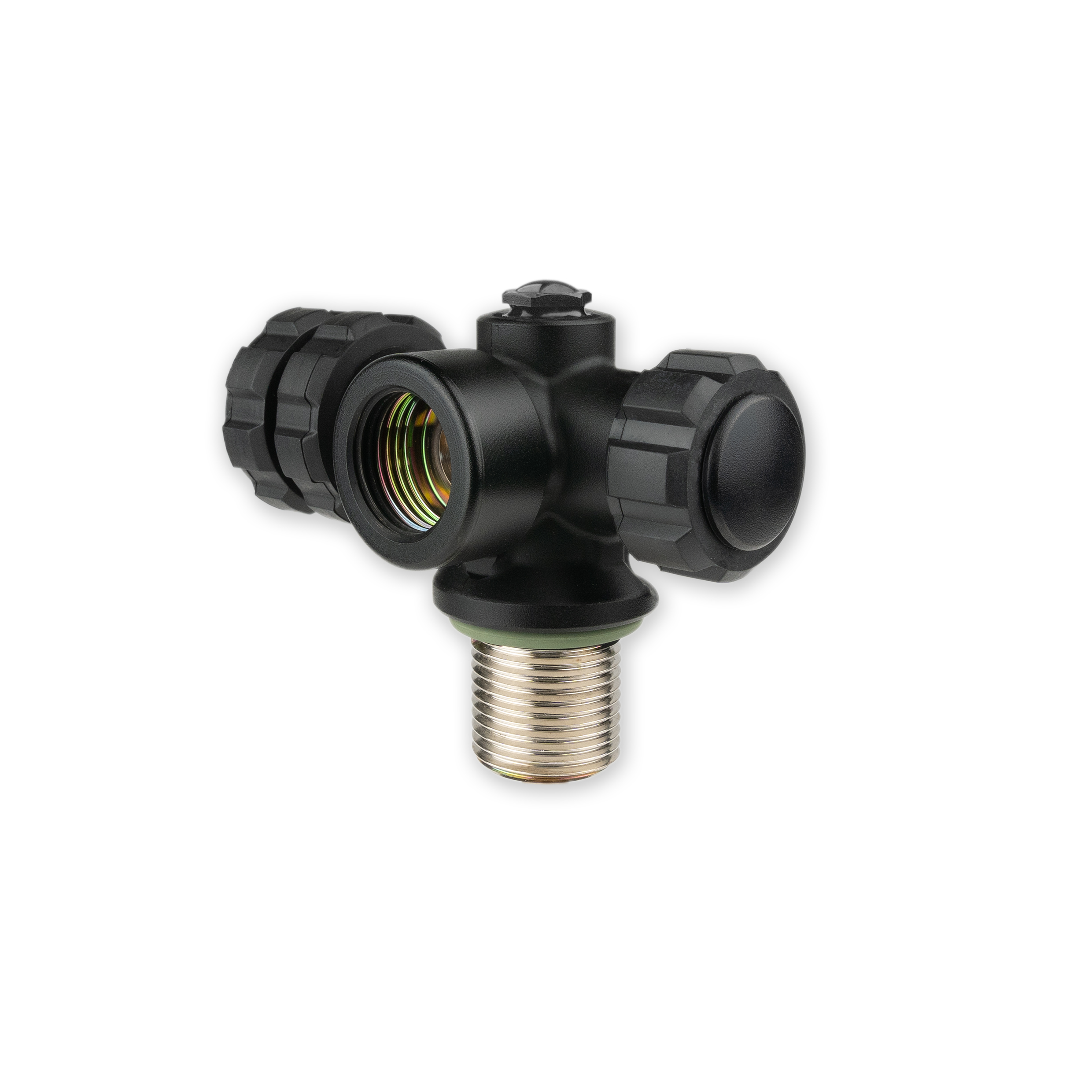 Tank valve specifically designed for sidemount diving. Tank neck thread is 3/4“ NPSM (US-Standard). Nautec SLS-L and SLS-R valves are standard shut off devices in accordance with DIN EN 12209-2 (G 5/8“), for an operating pressure of 232 bar. Depending on the model, the shut-off mechanism is arranged either 90° to the left or 90° to the right of the regulator connection. On the opposite side of the knob there is a about 35 mm valve body extension put into place. This prevents the bungee loop from slipping off.