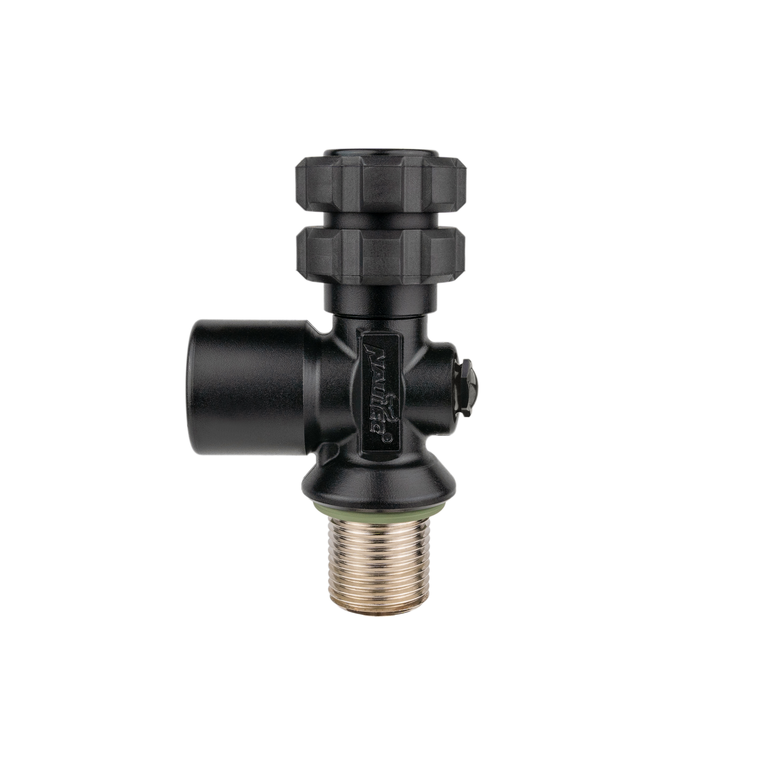 For mono scuba equipment with tank neck thread accordance to US-Standard ¾“ NPSM. Nautec S Valves are standard shut off devices in accordance with DIN EN 12209-2 (G 5/8″), for an operating pressure of 300 bar with vertically arranged shut-off mechanism and outlet. Only 1 first stage can be connected.