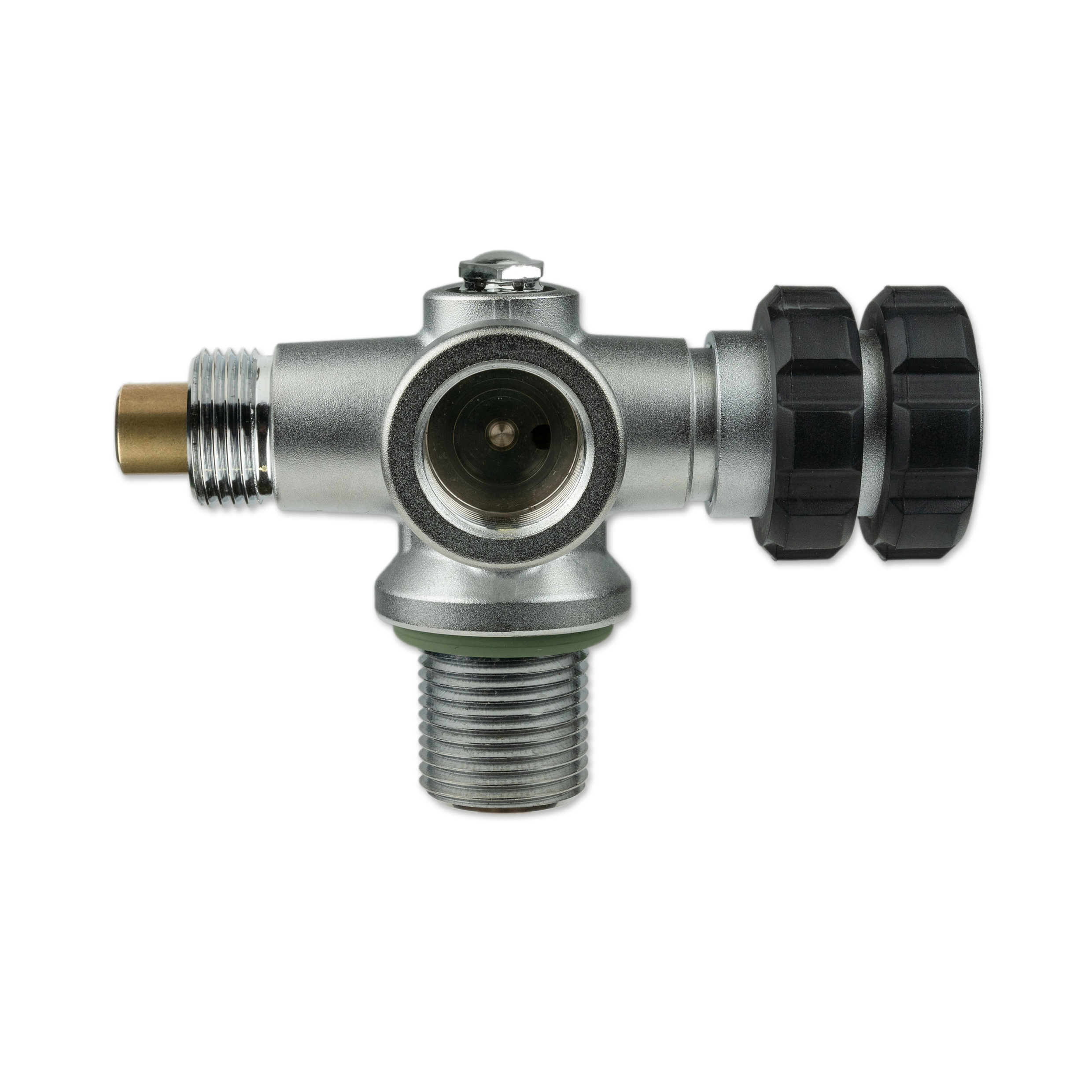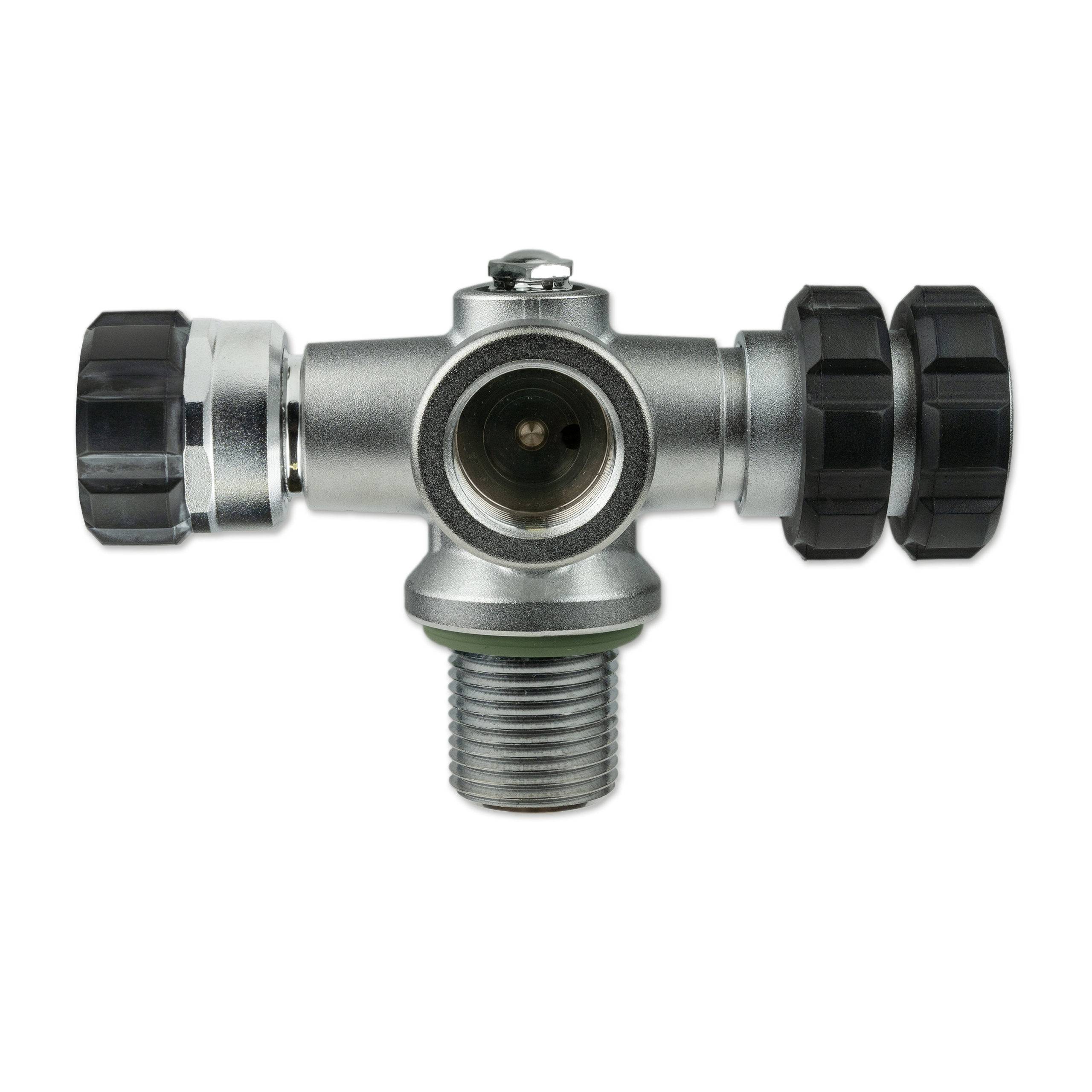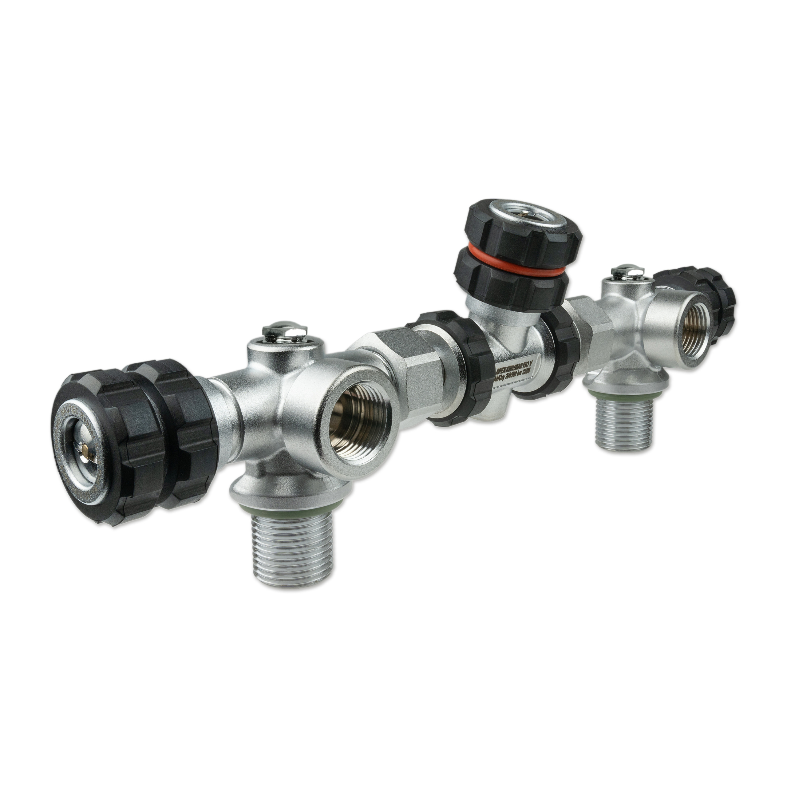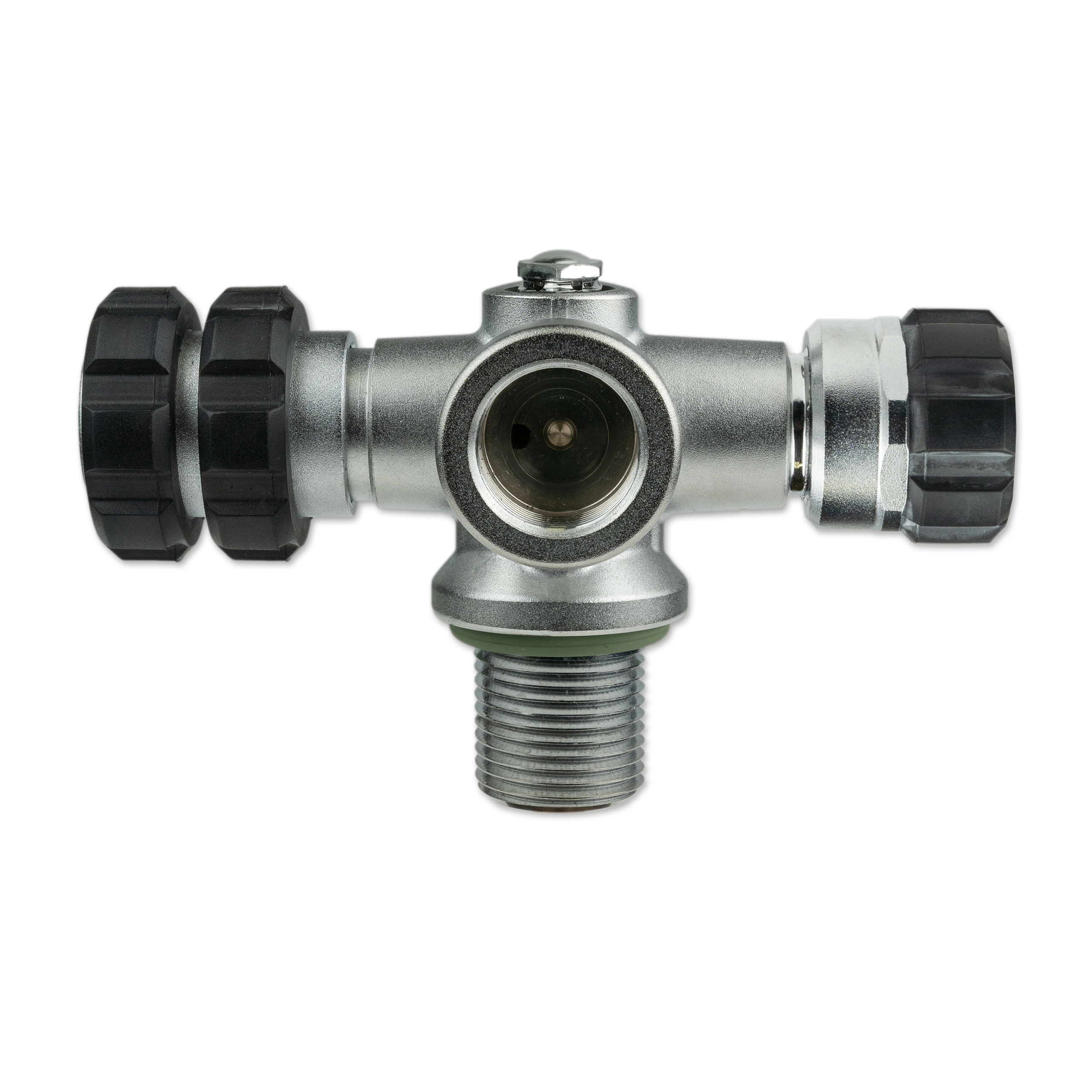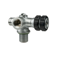 All valve outlets can be shut off separately, the gas flow can be safely turned off using the Nautec TEC manifold between two flanges. Located opposite the hand wheel, is a connection port for a stub pressure gauge or a dive computer transmitter with 7/16″ connection thread.