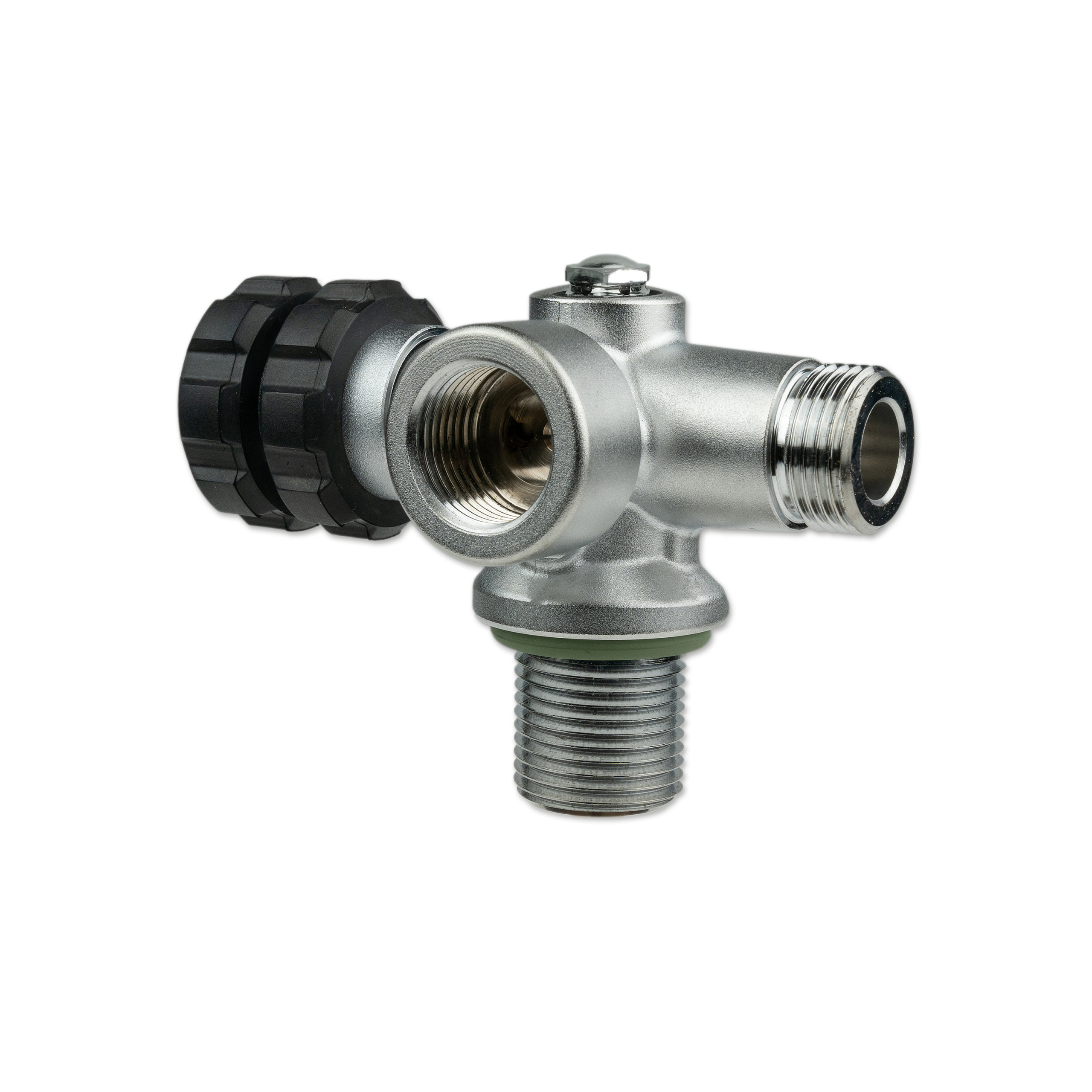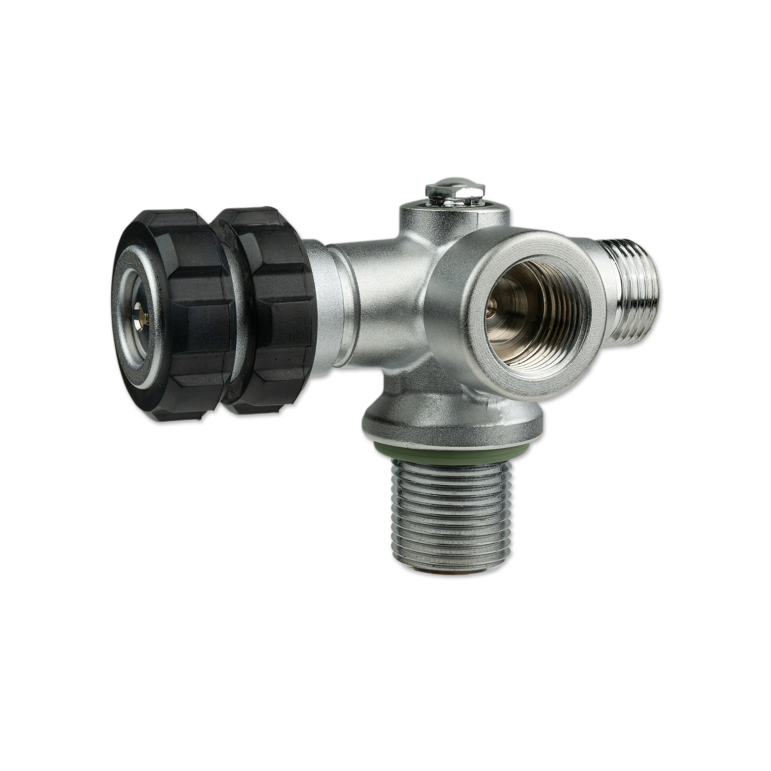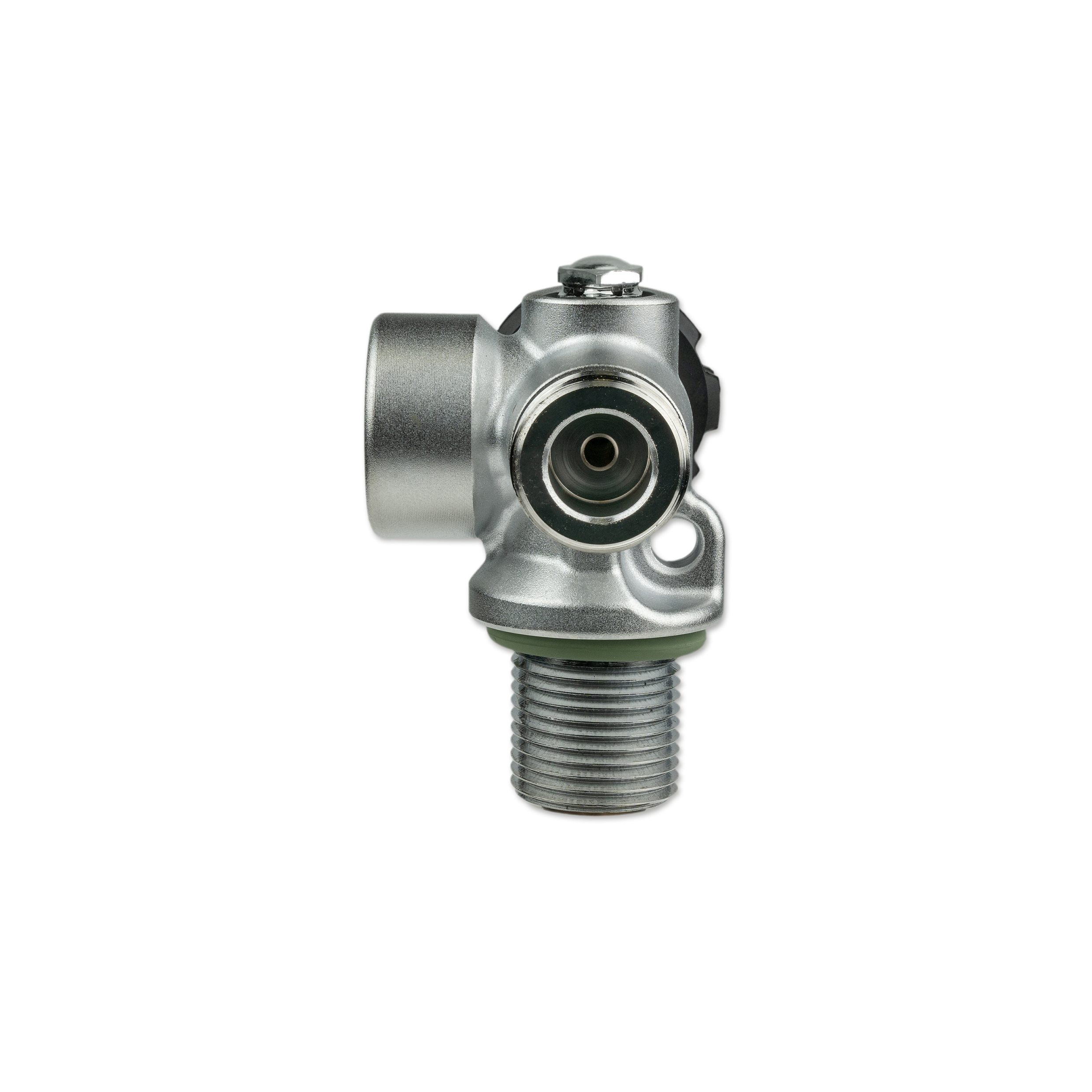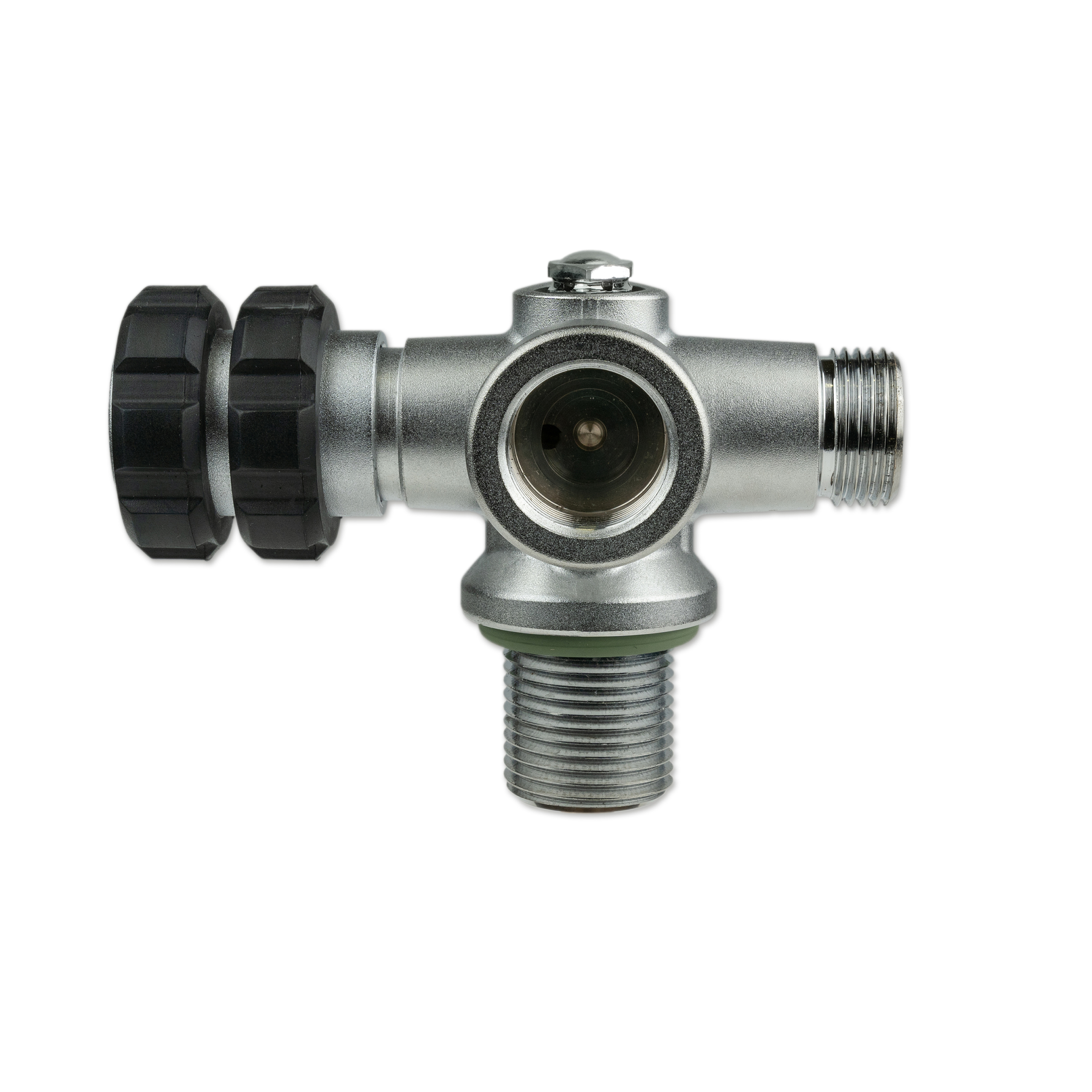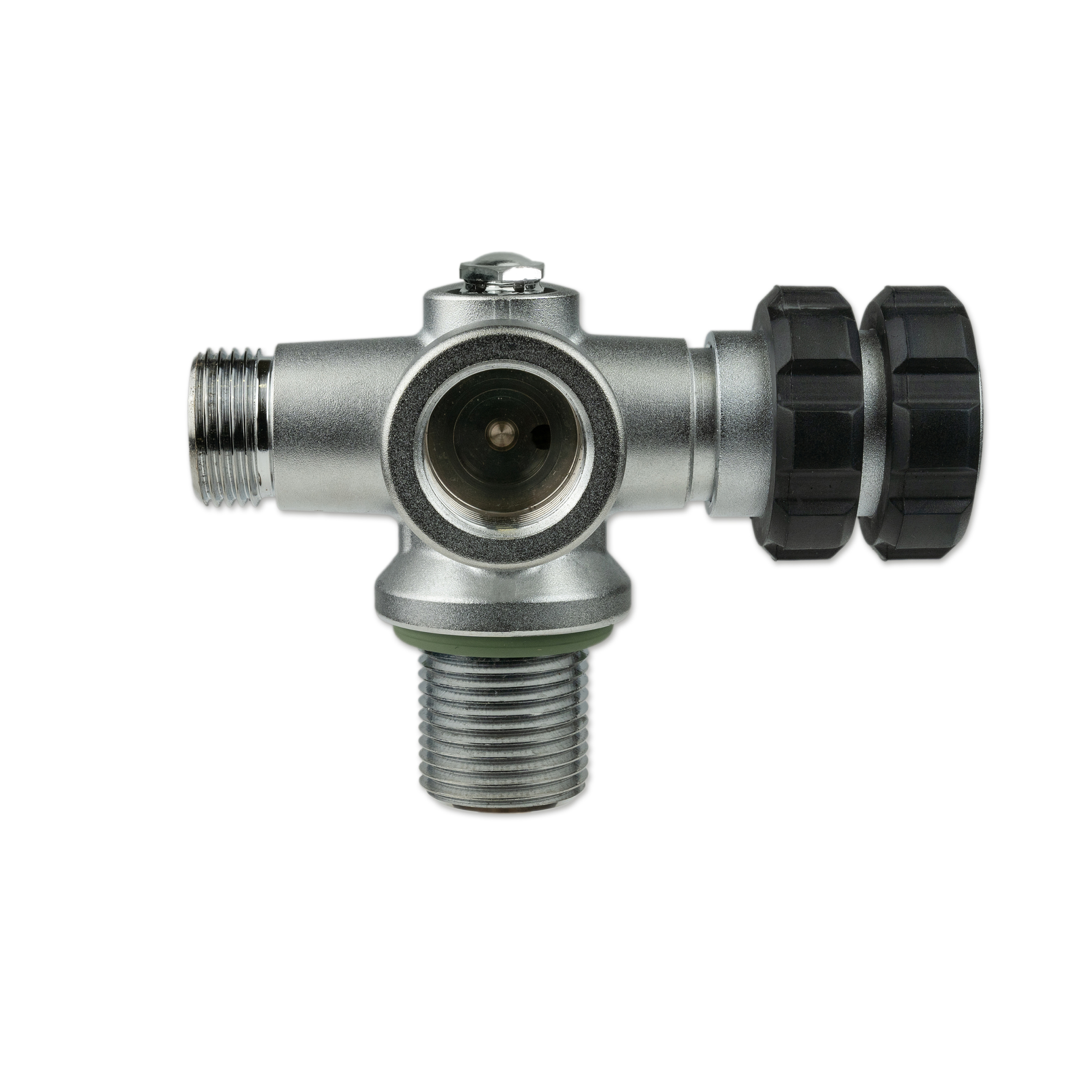 All valve outlets can be shut off separately, the gas flow can be safely turned off using the Nautec TEC manifold between two flanges. Located opposite the hand wheel, is a connection port for a stub pressure gauge or a dive computer transmitter with 7/16″ connection thread.